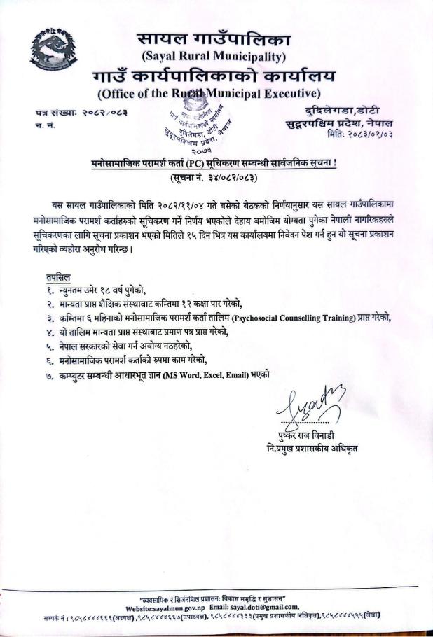 मनोसामाजिक परामर्श कर्ता (PC) सूचिकरण सम्बन्धी सार्वजनिक सूचना ! (सूचना नं. ३४/०८२/०८३)