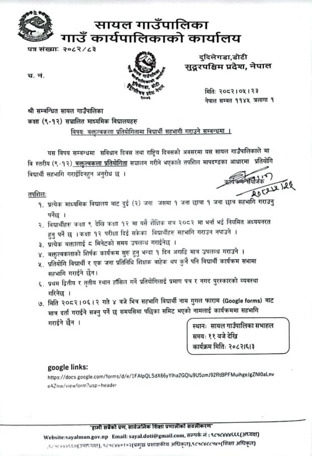 विषय: वक्तित्वकला प्रतियोगितामा विद्यार्थी सहभागी गराउने सम्बन्धमा।