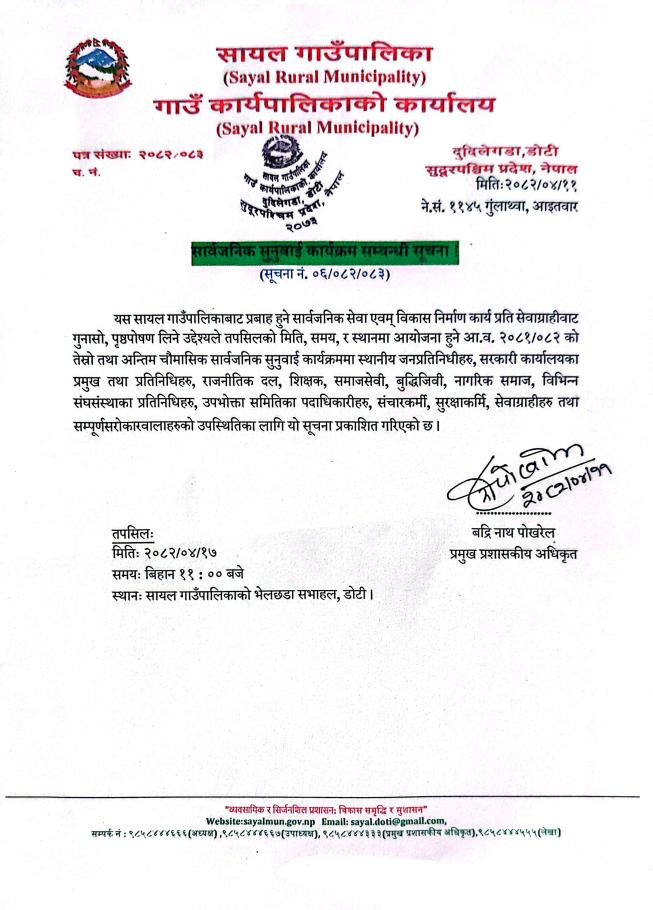 सार्वजनिक सुनुवाई कार्यक्रम सम्वन्धी सूचना !